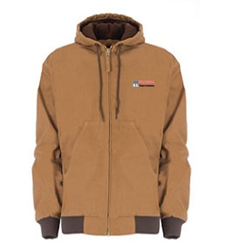 Water repellent finish Triple-needle stitched main seams Heavy-duty brass front zipper Two front patch pockets Three-piece insulated hood with drawstring Three inside chest pockets, right with zipper closure